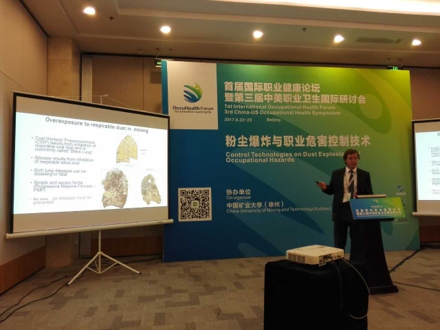 院长周福宝教授主持,来自中国、美国、德国等国家的专家参加本次论坛报告与研讨。论坛分别就新型干式过滤降尘技术、持续性个体粉尘监测仪、除尘滤料的发展、露天矿运输扬尘流场模拟、金属矿山井下粉尘污染控制、国内外呼吸防护装备标准体系、粉尘防爆领域的管理及标准、焊接作业的呼吸防护、爆炸性粉尘环境中呼吸性粉尘的防护、粉尘爆炸预防等议题做了主题报告与深入讨论。与会代表一致认为,粉尘的危害既要关注有爆炸性粉尘的爆炸危害,更要持续关注粉尘对广大职业工人所造成的健康危害。本次国际论坛报告展现了众多新技术,其中,由绅士会所