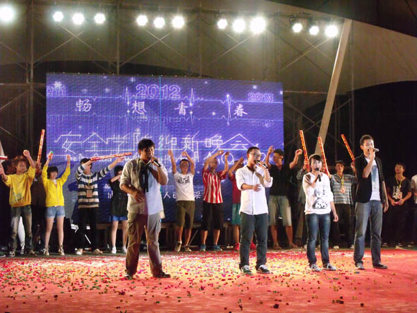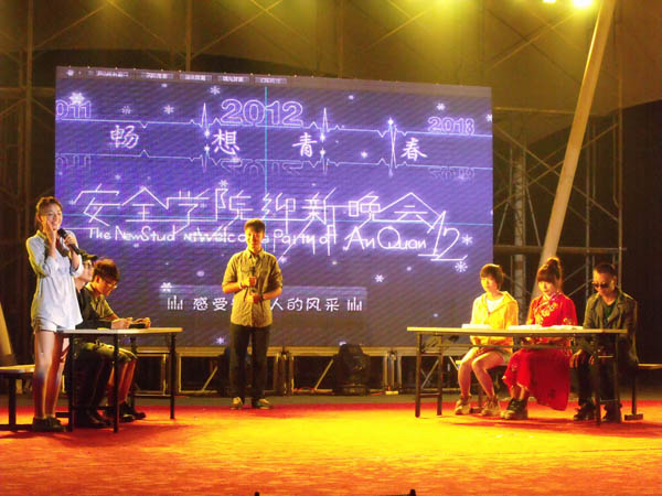 9月21日晚,安全学院主办的“畅想青春”迎新晚会在镜湖广场成功举办,院执行院长周福宝、党委副书记钱雄、学生工作办公室主任孙留涛老师以及各年级辅导员老师带领安全2012级全体新生到场观看。