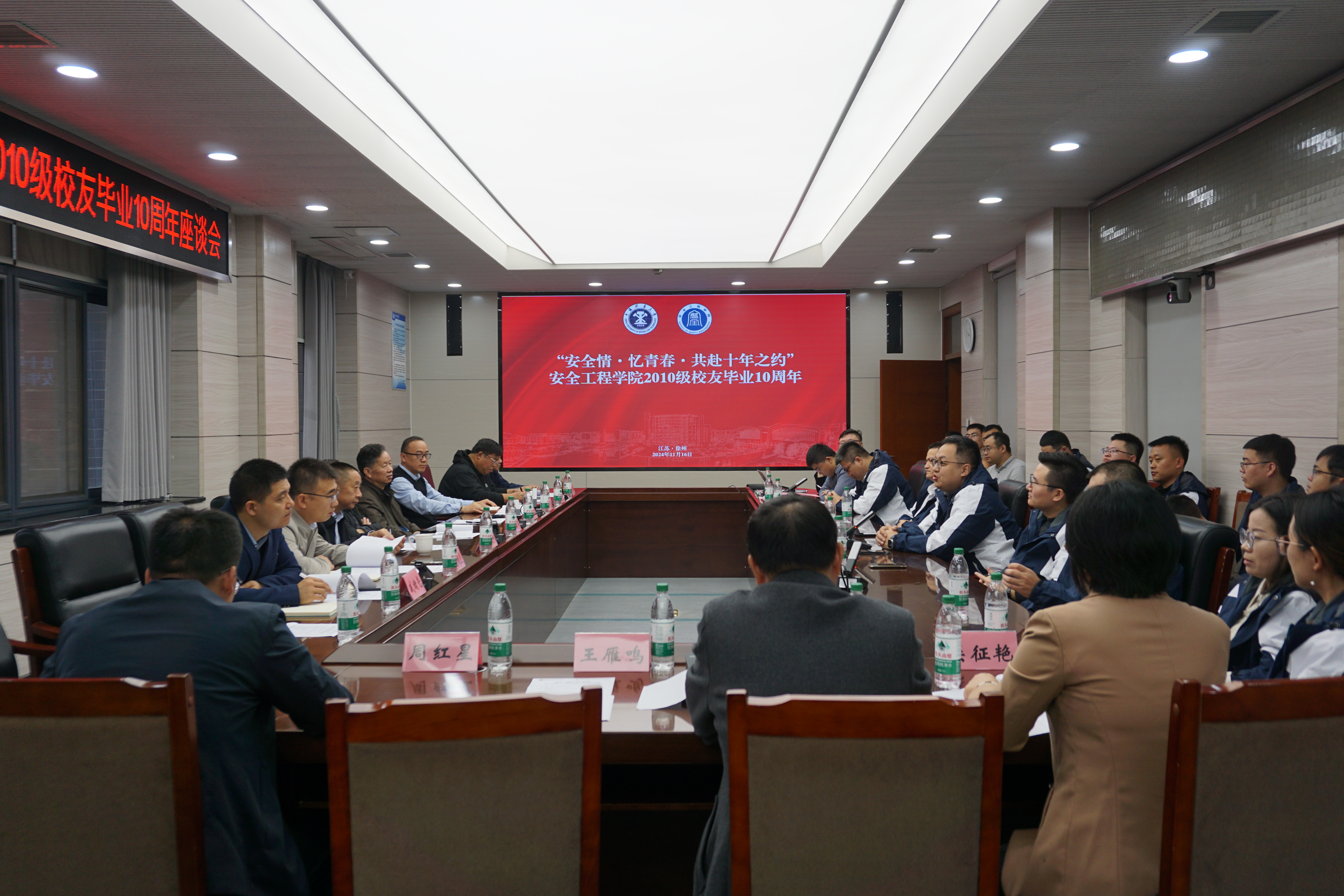 2010级校友毕业十周年座谈会。院党委副书记邵波、副院长刘晓斐、工程中心副主任胡惠强,原学院党委书记章毛平,学院林柏泉教授、程远平教授等部分教师代表及29名2010级返校校友参加了本次座谈会。学工办主任刘世通主持本次会议。