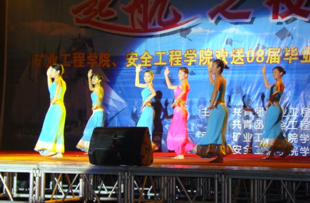 晚7:30,晚会在一首《离歌》的高亢的旋律中拉开帷幕,民族舞蹈《西水长长》充满了浓浓的异域风情,歌曲独唱《奔跑》深情款款,让人们激情澎湃。相声《进化论》幽默诙谐、惹人开怀。小品《奥运志愿者》以一种特殊的方式体现出当代大学生独特的奥运情怀。歌伴舞《上海姑娘》柔情暖意,渗入眼眸,劲舞《七彩的明日》则青春洋溢,激情绽放。伤感的歌声淹没不了青春澎湃的激情,离愁的背后展示出的更多的是一种深深的祝福。小品《跟往事干杯》将晚会推向了高潮,平淡的言语述说着他们四年来的酸、甜、苦、辣。随后矿业学院党委书记姬长生老师深情独唱《有一个美丽的地方》带领大家领略了别样风光,把整场晚会的气氛推向了高潮。接着诗歌朗诵《你记得吗》让大家重温了大学四年的平凡与辉煌,忧愁与欢乐,充满深情的言语中传达出了他们对母校、老师和同学的依依难舍之情,离别的情绪深深感染了现场的每一位观众。随后,本场晚会的神秘嘉宾:安全学院辅导员孙留涛、矿业学院辅导员范军及04级两位班主任老师走上舞台,带去了学院对全体大四同学的依依惜别之情和良好祝愿,祝他们在以后的人生道路上一路走好。至此,整场演出画上了一个圆满的句号。