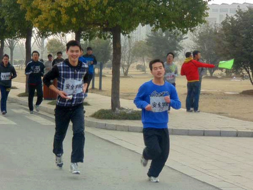 仅有两名女同学参加,但他们相互鼓励,奋勇拼搏,取得女子组 团体总分第13名的好成绩。随后,男子组比赛在热烈的呐喊声中正式开始,比赛角逐非常激烈,选手们你追我赶,互不相让。不仅参赛同学充满激情,在道路两旁助威的拉拉队员们也异常兴奋,寒冷的天气也没能扑灭他们的热情,欢呼声、加油声此起彼伏。最终安全学院的赛拉力同学获得第12名,李钊和李小强同学挺进前30,安全学院勇夺男子团体总分第一名,实现历史性突破。
