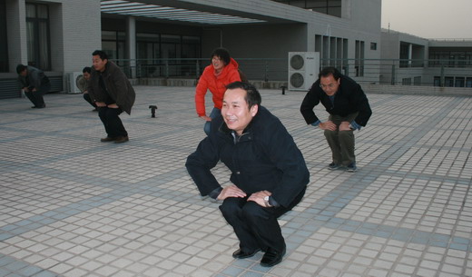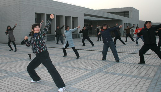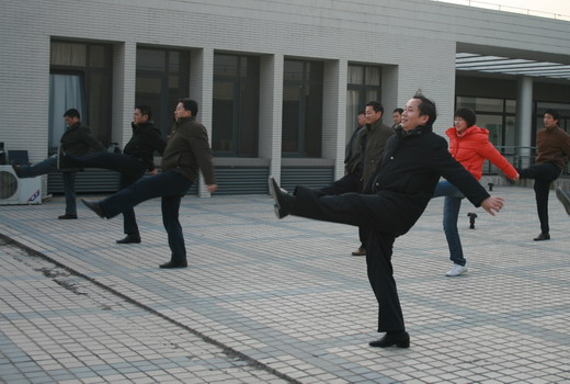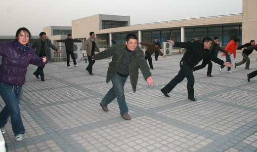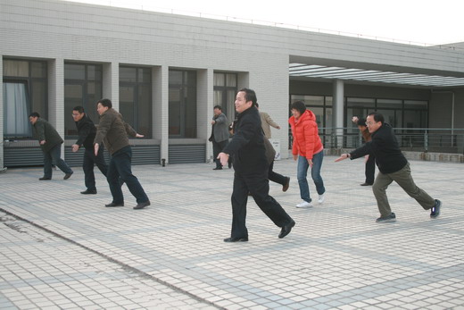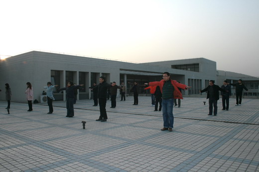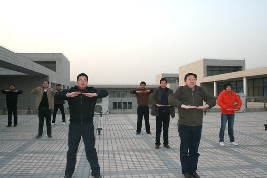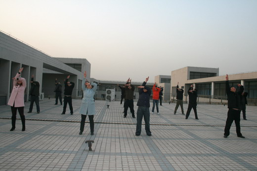 王德明院长、章毛平书记、李金明副院长、钱雄副书记更是坚持每天必到,勤加训练,力求规范,起到了良好的带头示范作用。在学习广播体操中,全体参与的教职工都认真学习每个动作,为达到整体划一,既进行整体排练,又分排练习。练习过程中,教职工们个个劲头十足,态度认真,从预备节开始,踏步、举臂、抬头、踢腿、跳跃到最后整理运动的深呼吸,大家是每一个细节都不放过,每一个动作都力求完美,一招一式是有模有样,整齐划一。对个别学习动作上有难度的教工,教练员吴征艳老师认真予以纠正,进行个别辅导。全体教职工们在练习广播体操的过程中互帮互学,有时几个人给一个人看动作,作辅导,有时一个人给几个人喊操,大家在一起,有说有笑,如火如荼。