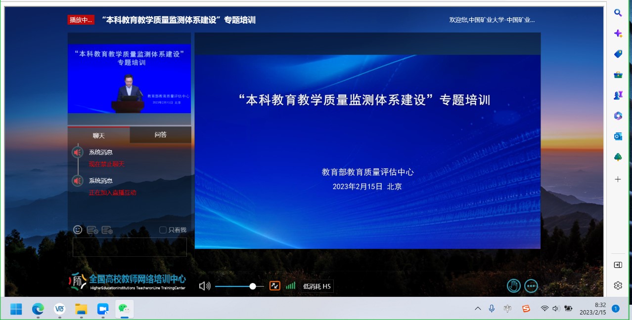 专题培训内容主要包括评估中心开展的本科教育教学质量监测和推进高等教育高质量发展有关情况介绍、《全国普通高校本科教育教学质量发展报告(2021-2022年度)》解读、《2021年度一流大学建设高校教学质量监测报告》解读、《2022年度全国应用型本科高校建设情况监测报告》解读、《全国普通高校本科教育教学质量发展报告》应用案例分享、高等教育质量监测国家数据平台数据采集和使用案例分享等等,老师们认真观看了培训内容。