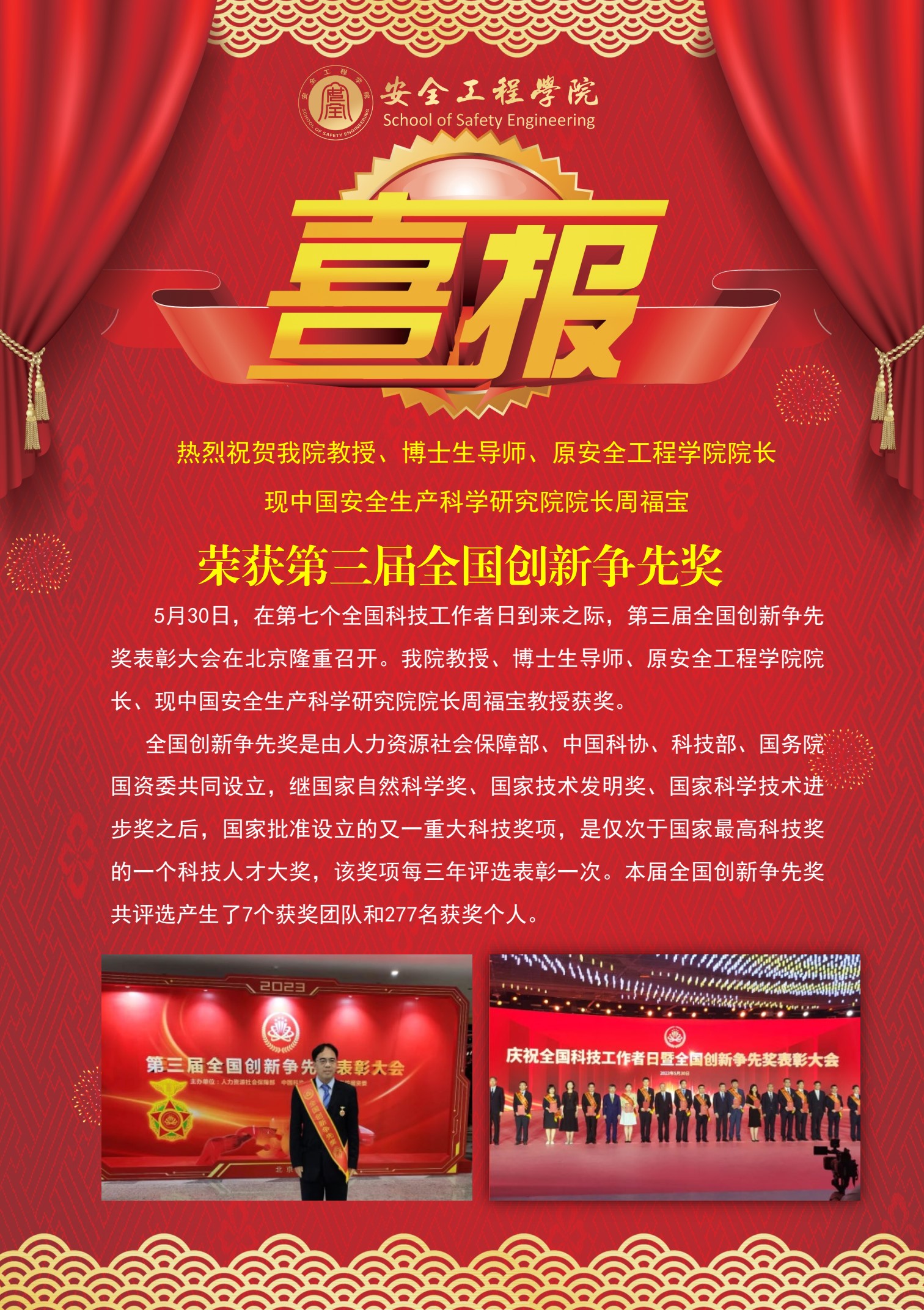 热烈祝贺绅士会所 教授、博士生导师、原绅士会所 院长、现中国安全生产科学研究院院长周福宝教授荣获第三届全国创新争先奖