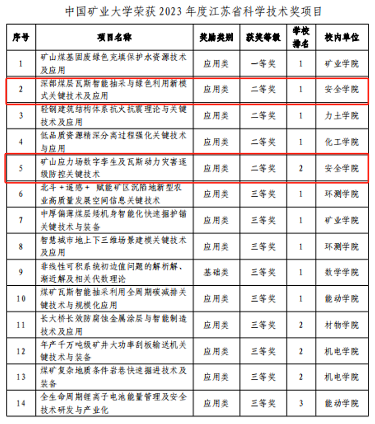 翟成教授主持的“深部煤层瓦斯智能抽采与绿色利用新模式关键技术及应用”和杨威教授主持的“矿山应力场数字孪生及瓦斯动力灾害逐级防控关键技术”2个项目均荣获2023年江苏省科学技术奖二等奖。