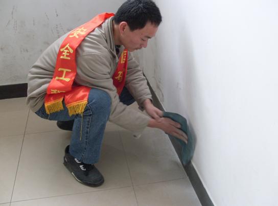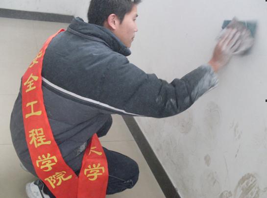 经过简单的分组后,各志愿者纷纷拿着砂纸对楼道墙上的污迹进行清理。劳动中,同学们不怕脏不怕累,经过半个多小时的紧张劳动,本来布满污迹的墙角顿时干净如新。