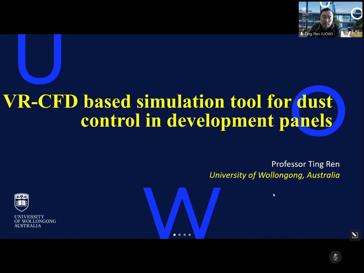 任廷祥教授在第一场报告中介绍了澳大利亚矿井开拓巷道掘进通风系统和装备,分析了巷道掘进过程中矿尘的产生规律和主要影响因素,分享了一种基于VR-CFD的开发面板粉尘控制模拟工具。该系统基于新南威尔士州某矿井的掘进面粉尘数据条件建立,可进行多场景的多点粉尘源的瞬态仿真模拟,实时处理适当数量粒子以保持整体视觉保真度。该系统可实现用户控件,完成了CFD-VR系统业界应用演示及健康安全培训。