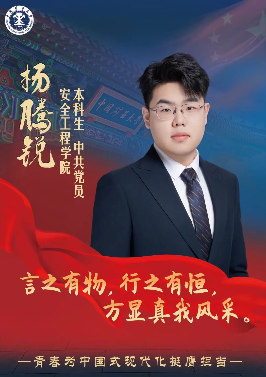 习近平总书记在党的二十大报告中寄语青年:当代中国青年生逢其时,施展才干的舞台无比广阔,实现梦想的前景无比光明。杨腾锐同学牢记习近平总书记的教诲,始终朝着德智体美劳全面发展的目标奋勇争先,为中国式现代化的建设和中华民族伟大复兴贡献出自己的青春力量!