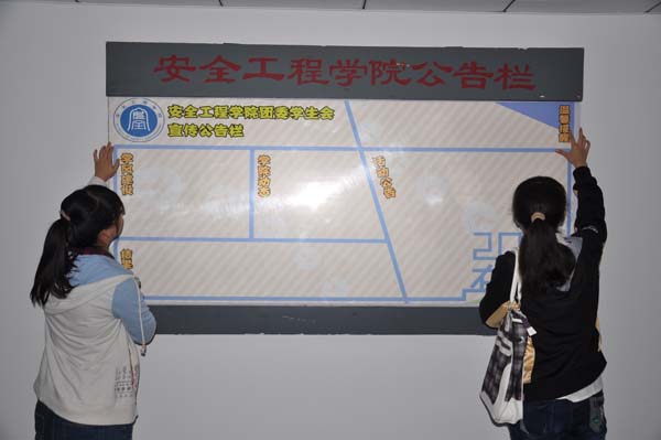 此次设置公告栏活动。预示着团委学生会的工作开始在新生层面展开,慢慢步入正轨,也为新生进入安全学院团委学生会这个大家庭,为今后的学生工作奠定了基础。