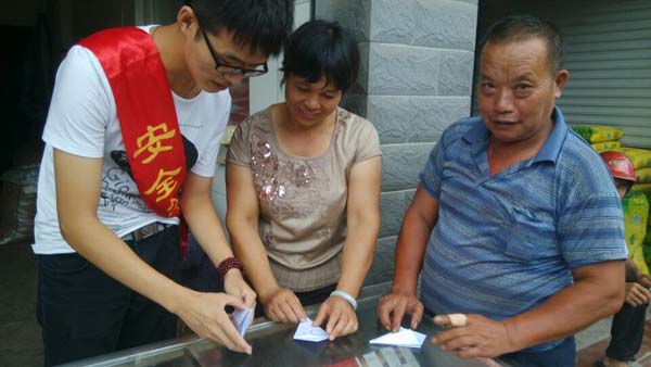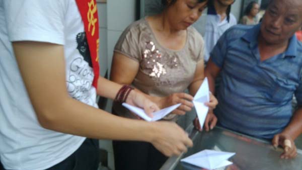 “寻找蓝天”社会实践团在文昌居民区内两个人一组,分组行动,争取能够实现最大程度的落实。活动一开始,小队成员们便在自己负责的区域内挨家挨户的敲门,紧接着向每一户乐意配合此次活动的家庭介绍这次活动的内容,小队成员首先有礼貌的向他们询问在平时生活中的环保措施,但大部分的家庭表示并没有过多的涉及这方面的行动。了解到居民在家用环保知识的欠缺后,小队成员耐心地向他们传授实用的环保小诀窍,如:用节能灯代替普通白炽灯;电器不使用时应切断电源;淘米水可用来洗菜或洗碗,洗完菜的淘米水可用于浇花;残余茶水可用来擦家具;方便筷或竹签使用后可以回收利用,做成工艺品,还有平时家里的废纸可以用来折叠成小盒子,盛放一些家里的垃圾,方便清理。小队成员甚至现场教给居民折纸盒子和一些简单工艺品的方法。一些家庭在听完家用环保小诀窍后便立即付诸实际,并表示将会持续做下去,为环保出一份力。
