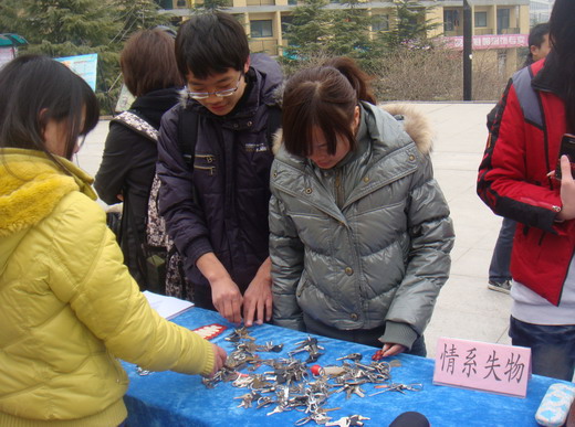 青年志愿者协会成员来到第二食堂广场。他们首先将近期由拾金不昧的同学捡获的失物陈列在桌子上来等待失主认领,这些失物从钥匙链眼镜盒到数码播放器,数码相机不等,这里的每一件都显示了我矿大人拾金不昧的高尚品质,证明了雷锋精神在绅士会所