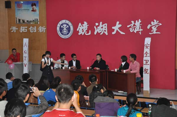 比赛于下午2点准时开始,首先,主持人介绍了比赛的流程,包括培训成果及礼仪风采展示、巧辩答疑和现场纠错。比赛前,进行了双节棍表演。安全学院第四个登台表演,在表演之前由女生部部长韩来颖对为期15天的礼仪培训成果进行了展示,稍后表演也正式开始,安全学院出场前的舞台布置独特,立即提起了现场观众的兴趣。礼仪情景剧更是独特新颖、妙趣横生,表演形式采取多人表演,其中13-4班焦阳担任表演主持进行画面暂停并解说。由观众席看过去,如同看一段视频,然后突然暂停,然后对刚才不文明的表现进行评说。表演者固定时姿态各异,引来观众的阵阵掌声和欢笑,在欢乐中普及了礼仪知识,起到了很好的教育作用。