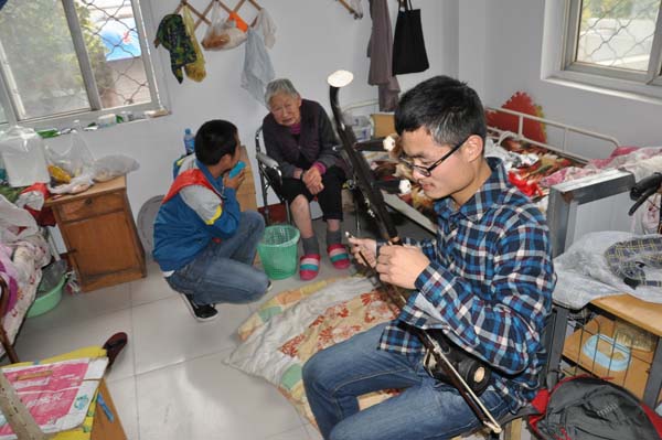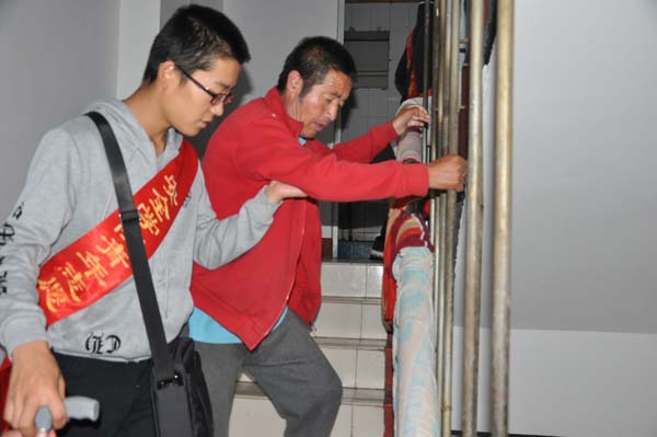 在老人的卧室里,志愿者紧握老人的双手,与老人亲切地交流着,老人们显得格外高兴,像亲人一般温和地望着志愿者。有一位爷爷给志愿者找出了他亲手绘制的一张张图画,图画看似普通,却充满着老人的心血,他每拿出一幅画都滔滔不绝地讲述着其中的故事,志愿者认真地听着并和老人共同咀嚼着他的回忆。有的老人还与志愿者玩起了棋牌游戏,现场一派其乐融融。