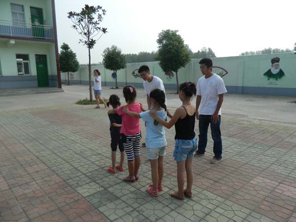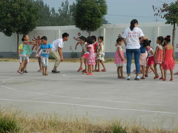 讲解游戏规则,志愿者们在一旁演示。同学们很聪明,很快就学会了这个游戏。于是在各年级负责的志愿者们带领下学生们分别开始了游戏。在游戏过程中操场上不停地回响着“左左,右右”的呐喊声,学生和志愿者们不一会儿便打得火热。接下来的团辅又进行了击鼓传花、丢手绢等传统游戏。活动在学生们的欢声笑语中顺利结束。