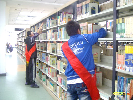 下午四点,青年志愿者值班活动在图书馆正式展开。青年志愿者们佩戴绶带,开始了认真的整理工作。在活动过程中,他们严格地遵守图书馆的规定,在不打扰读者阅读的前提下,静静完成工作目标。志愿者们按照书的编码,将被随便乱放的书放回原位,同时将杂乱的书摆放整齐,为读者的查找和阅读提供了方便。除了整理图书,他们还积极的进行了书架的清洁工作,拭去书架上的尘土,为图书馆增添了洁净和美丽。