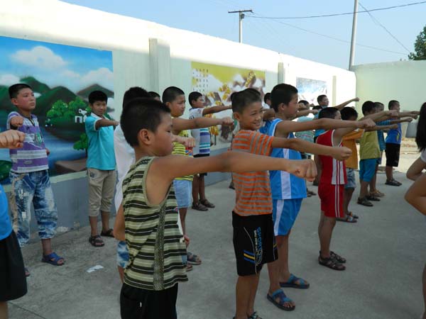 下午3时,在经过了一天最热的时刻后,操场上的温度已经开始逐渐降低。老师们在教室里讲完安全知识和体育卫生常识后,就带着同学们走出教室。同学们听说要学习武术,都显得异常兴奋,身体不由自主地比划起以前看电视或者看书本时学到的动作。同学们在操场上集合完毕后,志愿者们并没有立刻教他们武术技法,而是带领着同学们做起热身运动。一些顽皮的同学不想做热身运动,志愿者就走上前去,耐心的劝导,讲解热身运动的重要作用,一点一点的说服他们。最后,在确认所有的同学都做过热身运动后,志愿者们开始传授武术知识。