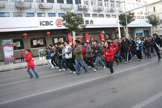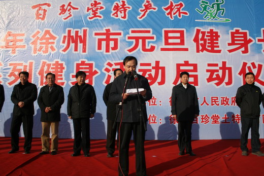 早上八点整,09、10级部分同学在辅导员刘筱婕、李成刚的带领下乘坐校车前往市体育中心田径场。所有方阵集合完毕后,首先进行的是起跑仪式,徐州市副市长段雄向参加元旦健身长跑暨系列健身活动的市民致以新年的问候,他指出:市委、市政府高度重视体育事业发展,竭力为广大市民提供良好的运动健身环境。当前,要以筹办第十八届省运会为契机,深入贯彻落实《全民健身条例》,积极推进全民健身活动,全面提升市民健身素质,为建设美好徐州而努力奋斗。接着,徐州市委副书记为长跑活动鸣枪发令。
