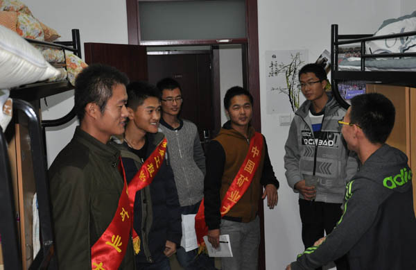 服务分队队员在队长齐世铭的带领下准时到达集合地点,并整齐戴上了绶带。为了检查工作的顺利进行分队队员都带上了绥带,晚上十点整,宿舍卫生检查活动正式开始。首先检查的是梅三的13级宿舍。在检查过程中队员们分工合作,有条不紊的对宿舍各个角落进行细致认真的检查并对每个宿舍进行评级,同时宿舍人员也积极配合检查活动,认真听取检查意见。而在对14级学生宿舍检查中,也许是初到学校并不太懂怎样整理宿舍,部分宿舍存在着物品摆放不起,地面较脏等一些问题。总的来说,梅三宿舍卫生总体上达到学院标准。同时,梅一宿舍也都做到了地面整洁,物品摆放整齐。