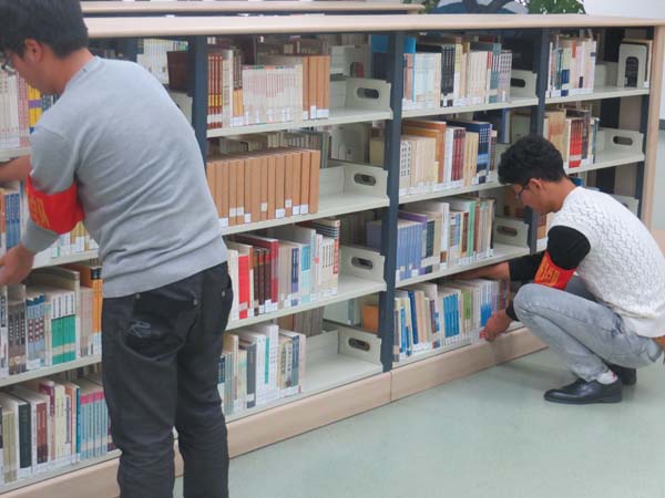 服务分队第一次参加图书馆共建的服务活动,活动前同学们认真听取图书馆老师的指导。本次活动的内容主要是整理图书,服务分队的四名同学每人拿了一个夹书板,随后到不同的书架去整理书籍。将没有放到书架上的书放回书架,再用夹书板将书籍挤压整齐,安全服务分队的同学们每一步都细心认真的完成。同学们忙忙碌碌的身影,徘徊在各个书架之间为图书馆学习的同学们营造了一个温馨美好的气氛。