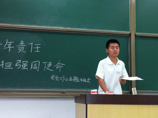 为充分学习胡江涛讲话内容,并从中明确自己的使命与责任,5月18日上午,安全09-2班全体同学齐聚教一C204召开“学习讲话精神,牢记青年责任,勇担强国使命”主题班会。班会由团支书刘建祥主持。