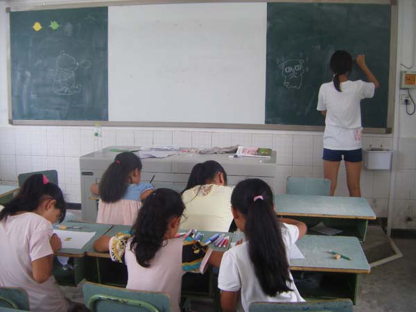 开课前期,小朋友们就迫不及待的询问是否有美术课,有的小朋友表示特别喜欢哆啦A梦,小朋 友们希望在老师的带领下能够画出自己喜欢的卡通人物形象。应他们的要求,曾梦茹通过微信表情、qq表情、百度图片等渠道搜集了大量简单卡通人物形象,并让小朋友挑选自己喜欢的图片,为上课做了充足的准备。课上,小朋友们领好纸笔便坐在座位上,和老师的黑板画同步进行。曾梦茹在黑板上画上各式各样卡通人物的简笔画,小朋友们规规矩矩坐在课桌前照着范例作画,十分认真,安静的教室只有沙沙沙的笔画声。画完一个卡通人物后,曾梦茹走下讲台,到小朋友桌旁为他们指导,她与小朋友们亲切互动,课堂气氛良好。有的小朋友问老师画的颜色要求,为了让小朋友充分发挥自己的想象力和搭配色彩的能力,曾梦茹告诉他们颜色的搭配不是唯一的,他们可以自己选择喜欢的颜色。绘画内容丰富多样,有荷兰著名的恬静小兔兔米菲,有来自未来世界的机器猫,有可爱粉嫩宇宙第一Hello kitty,还有世界上最受欢迎的海绵宝宝等等,这些都源自小朋友们对卡通人物的喜爱。