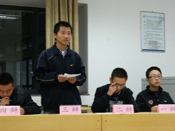 接着比赛进入总结陈词环节。正反双方四辩清晰的思路和巧妙的陈词给观众留下了深刻印象。最后比赛在一片掌声中宣告结束,在经过评委的商讨后,安全13-4班更胜一筹,获得冠军,2班则屈居第二,最佳辩手由2班的四辩崔捷同学获得。