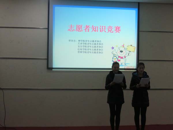本次知识竞赛由理学院都城刚青年志愿者协会主办,安全学院、艺术学院、管理学院和信电学院的青年志愿者协会共同协办,目的是展现新一代大学生的风貌,促进广大师生对志愿者及其服务的了解,更好的传承和发扬志愿者的服务精神,推动志愿者服务的蓬勃发展,同时也能够架起绅士会所
