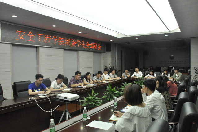 晚上7点,会议正式开始。安全学院团委学生会主席孙一伟向校学生会调研代表汇报了安全学院对学生会工作进行的改革和优化措施,具体讲述了学生会和团委下的机构设置、部门工作的制度优化、部长部员们的培优培养方案和活动筹备及取得的一系列成果等学生会工作。汇报结束后,校学生会调研代表们就汇报内容的细节进行提问,主席团以及部长团代表们分别进行了回答。学生代表也向调研代表们介绍了他们对于院学生会工作开展情况的体验与感受,学生代表对学院的学生会的工作进行肯定,他们表示学生会的学生服务工作做的非常及时到位,为学院的同学们在学习和日常的校园生活提供了很大的便利和帮助。同时他们也提出了一些对于学院学生会的学生服务工作的建议。最后,安全学院学生会主席团及部长们向调研代表陈述了院学生会工作存在的不足之处及需要改进优化的工作方案。