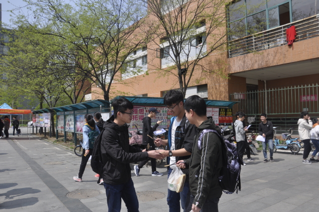 为建设环保节能的文明校园,倡导低碳、绿色生活方式,4月1日,安全学院公益部的干事在三食堂广场宣传“多筷好省”大型环保活动。