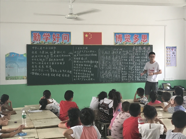 “仲夏希望”支教团在安徽省萧县陶楼小学开设国学课堂,教孩子们学习《弟子规》。