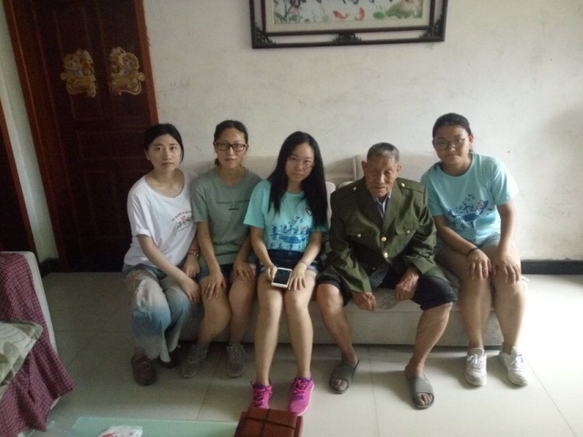 上午九时许,志愿者到达张士俊老前辈的家中,老前辈今年已有86岁高龄,耳朵已经听不见了,所以对话均由家属进行。老前辈入伍时只有14岁,当时所在部队是八路军二十三军九十八师,入伍之前家里条件很困难,母亲去世早,没有人管,所以自愿入伍选择杀敌报国。当时老前辈在山东趵突泉打鬼子,手榴弹扔到他们头上,他们都不投降,打完仗之后一个师仅剩五人。因为老前辈身体原因和天气原因,所以志愿者在与老前辈合影之后快速结束采访。