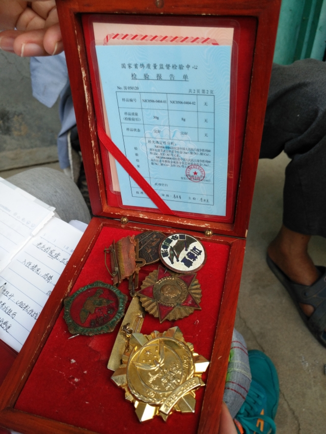 下午三时许,志愿者到达姚兆良老前辈的家中。姚老前辈今年已有93岁高龄,于1944年入伍,当时的他仅有16岁,因为个子太小所以进入流动队伍。老前辈在部队时先后参加淮海战役和渡江战役,他说:“二战时候,我是三连长,交给其他部队带走了,56年,淮海战役就开始了,徐州起点,打了45天还是55天,消灭国民党56万人,全部埋到了地耗里,彼此都能看见,还能听见声音。淮海战役把日本60多万人都消灭了,真的消灭了。接着就准备渡江战役了,我们用小木船过的江。我们十天走了1800里路,先到杭州后到上海,说杭州人早就解放了,我们又回头到上海去,后来去海岩守着。”在这之后老前辈也参加了抗美援朝战争,被国家偷偷运过去,总共打了五战,老前辈所在部队损失极大。采访结束,老前辈向志愿者展示自己的纪念章并与志愿者亲切合影。