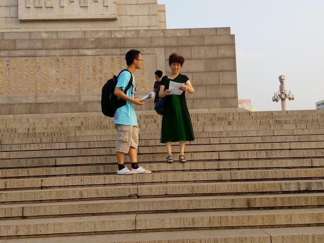调研小组首先进入广场参观升旗台,台基上写着江泽民总书记的题词——军旗升起的地方,走过升旗台之后小组成员在纪念塔参观。看到很多游客都在此驻足观赏,两位同学趁机发放早已准备好的宣传单及调查问卷,游客们仔细阅读小组的宣传单,并对问卷所涉及的军史党政问题一一作答,一些老大爷讲到那段峥嵘岁月还忍不住比划出各种手势,以再现当年的英豪气。应小组成员的邀请,游客与小组成员进行合影留念。随后,调研小组走近纪念塔周围的军史浮雕进行调研,据成员采访,喜欢红色浮雕的不仅是革命老战士和一些刚加入少年先锋队的同学,还有一些英雄城的情侣们。
