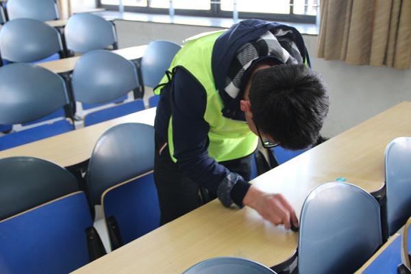 中午1点40分,各个学院在青春广场集合完毕。首先进行了“清理课桌”文化节的开幕式活动,强调了本次活动的目的和意义。下午两点半,活动正式开始。力建学院主要负责博学2楼A区和博学4楼A区的清理活动。首先,学院负责人将所有志愿者分成了两支小分队,分别由负责人有序地带到指定地点开始清理。在分配好相应教室后,志愿者们积极迅速地投入到清理中去,用携带的盆、桶和抹布等工具对课桌上的涂抹等痕迹进行了擦拭,难以清理的地方就用指甲努力抠掉。在清理课桌的过程中,志愿者们始终保持安静,没有对自习的同学造成影响。虽然任务量很大,但是志愿者们服务热情高涨,在志愿者们的努力下,两个区域的教室课桌很快焕然一新。下午四点,活动顺利结束。
