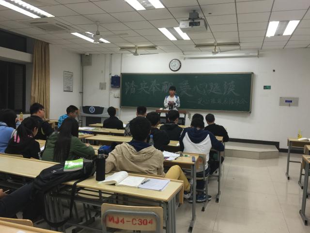 晚上七点,班会正式开始。首先,负责人带领同学们回忆两月以来的爱心班级活动,有校内清洗运动器械活动,有校外救助小动物活动,也有校外禁毒日宣传活动······回忆之后,负责人引用了雷锋、焦裕禄等人的例子,告知同学们要向他们学习,踏实奉献,为社会贡献出自己的力量。班会期间,有同学还就最近去的小动物救助中心志愿者用心照顾小动物为例子,阐述了他对踏实奉献的看法。接下来负责人说明了接下来一个月爱心班级活动的规划并且希望同学们能够继续踏实奉献,将爱心继续延续给需要帮助的人。最后,班会在大家的掌声中结束。