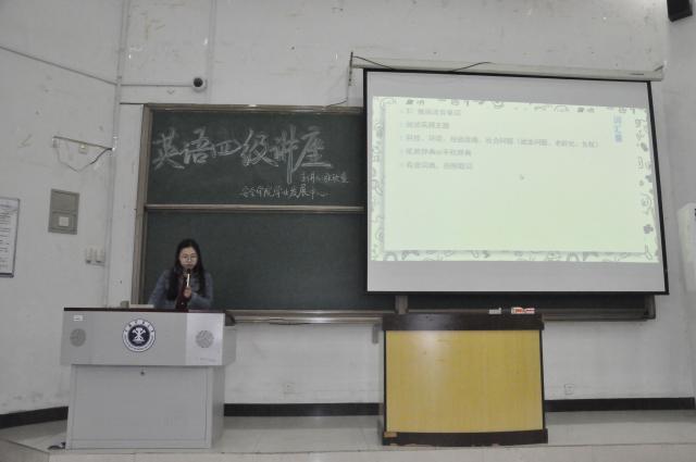 下午两点整,讲座在主持人的带领下正式开始。首先,张欣童就备考四级的复习阶段向同学们作了大致说明,使同学们明确了具体时段该如何着手复习。其次,她根据四级的题型(听力、阅读理解、翻译、作文)向同学们讲解具体的复习方法。在听力方面,她向同学们介绍了几个主要的训练方法(如看美剧、通过做题来熟悉听力语境等),希望同学们能够借助这些方法从基础开始扎实的训练听力。随后,同学们积极地向张欣童提出了关于英语四级备考注意事项的问题。在关于背单词和题海战术选取的问题上,张欣童表示单词是英语的基础,单词背熟了,题海战术才能取得显著的效果。最后,长达一个多小时的讲座在同学们的热烈掌声中结束。