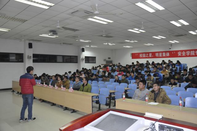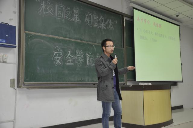 当日晚上7点整,讲座准时开始。各位同学依次上台进行ppt展示和分享他们的学习、工作经验。首先,“班集体之星”张加林同学向同学们介绍了孙越崎学院的概况并强调了集体学习的重要性。第二位是“宿舍之星”谢红娇同学,她通过ppt展示了她们的宿舍,向同学们说明了宿舍氛围对于同学发展的促进作用。接下来的是“学习优秀之星”刘凯同学向同学们介绍了许多的学习方法。然后是“科研之星”杨进林同学讲解了科研对发展同学门素质的积极作用并鼓励同学们踊跃参加活动。第五位“自强之星”张晋彰同学通过自身获得的许多成就结合学习方法向同学们讲解了确定一个目标对大学学习的重要性并鼓励同学们努力学习。最后一位上台的是“活动之星”何兴祥同学,他向同学们讲解了参加活动以及组织活动的积极意义,并从举办方角度分析同学们为何会对某些活动产生偏见,引起了同学们的深思。最后,是问答环节,在数位同学积极提问后,由何老师总结,此次讲座顺利结束。