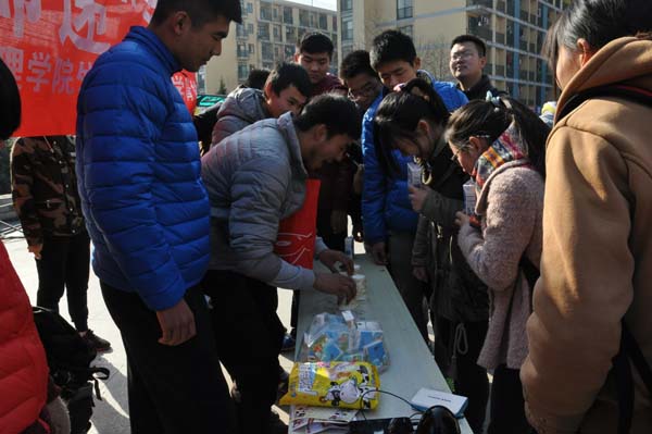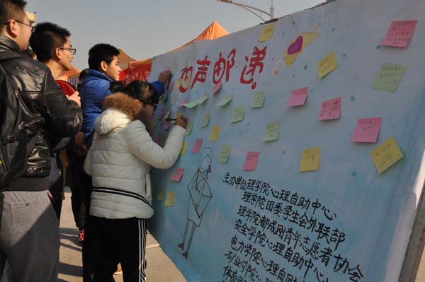 为了拉近同学们之间的距离,使同学关系更加融洽。12月19日中午12点,由安全学院、电力学院、矿业学院、体育学院、艺术学院以及理学院心理自助中心、理学院团委学生会外联部、理学院都成刚青年志愿者协会联合主办的“心声邮递”户外活动在二食堂广场成功举行。本次活动以“人际沟通,部门宣传”为主题,旨在向同学们介绍一些实用的人际交往技巧。