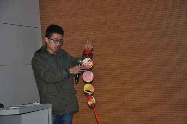 下午两点,大赛正式开始。本次创意大赛以小组或个人为单位,选用各种材料制作自己的创意作品,并选派代表进行答辩。参赛作品可分为经管人文、化工材料、电子信息、力学建筑和艺设体育五大类。在决赛现场,参赛选手带着自己的作品向评委和观众做了精彩的介绍。其中来自安全学院的作品是14级安全3班同学的废旧光盘再利用和可调节手机固定夹,以及13级安全2班同学的环保类创意“易拉罐的独白”。其中“易拉罐的独白”作为本次大赛中唯一的环保类作品,亮出了自己的独特色彩。本次大赛得分最高的作品是由安全学院13级3班张宏民与环测学院的两名同学合作完成的飞行器,该创意在构思和实践运用上都得到了评委的高度评价。同时,来自力建学院的可升降拉索桥、艺术学院的玻璃展厅、国际学院的护堤鱼竿架座等作品也都新颖独特,难分伯仲。最终安全学院蒋静宇老师发表讲话,他不仅充分认可了同学们的创新精神以及科研能力,此外他还鼓励同学们多参与科创活动。至此,比赛圆满结束。