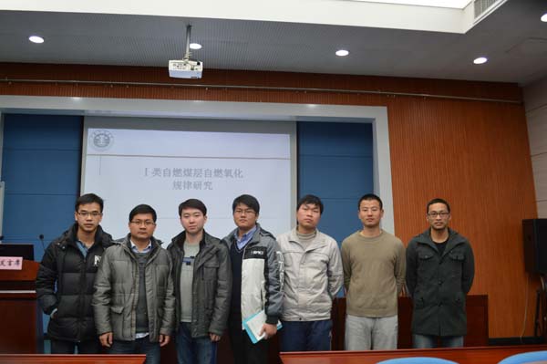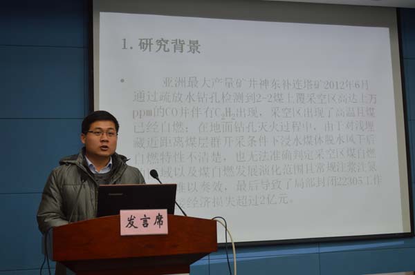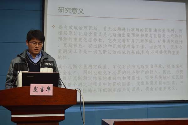 魏伟首先作报告,报告题目是《Ⅰ类自燃煤层自燃氧化规律研究》,他以袁店一井煤矿3煤层为研究对象,介绍了Ⅰ类煤层自然发火规律,内容充实,汇报详细。随后,孙旭明介绍了如何利用均衡通风原理优化矿井通风系统。紧接着是贾靳就海孜7#煤解吸特性做了相关介绍。王斌在报告中阐述了暴露时间对的瓦斯含量测定的影响,在他的报告中研究了暴露时间对瓦斯测定结果各部分瓦斯含量的影响程度。随后,冯辉、杨继超、许浪分别就《贺西煤矿首采层开采后下伏煤层卸压特征研究》、《水力化钻孔径向瓦斯渗流特性实验研究与应用》、《矿井瓦斯爆炸安全距离的探讨》做了相关介绍。