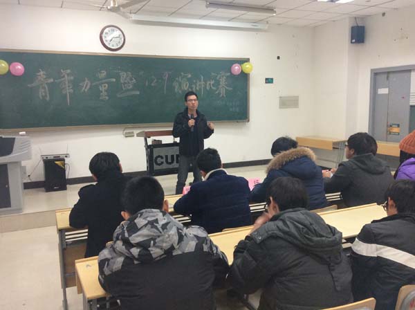 知行社举办的“青年力量暨,纪念一二・九运动”演讲比赛于教四B302激情开讲。担任此次比赛评委的有安全学院知行社社长常航,学生会副主席彭扬,自管委部长齐世铭,矿业学院学生会部长靳振铎,艺术学院党员团支书徐军敏。比赛由修思琦与张俊毅主持。
