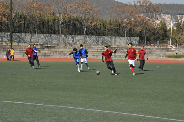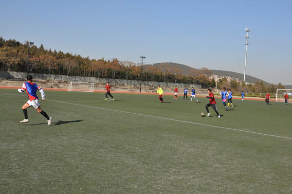 17日中午12:30,随着裁判员的一声哨响,比赛开始了。安全学院发球,双方迅速展开攻势。身穿深蓝色球服的矿业学院球员如惊涛骇浪,全力猛攻,多次逼近安全学院的底线。安全学院球员身着深红色球服,后卫与守门员精巧配合,铸成了一道铜墙铁壁,有惊无险地挡住了矿业学院一次次进攻。在裁判员的哨声中,上半场以0:0的结果结束。下半场比赛开始后,安全学院调整状态,反守为攻,场上局势更加紧张。在下半场进行到一半时,安全学院角球传中,在其他球员在门前巧妙配合下成功将球推射入门,首开记录,安全学院占据上风。矿业学院随后组织反攻,多次努力后也射进一球,追平比分。在接下来的比赛中,矿业学院在比赛即将结束之时打进奠定胜局的一球,取得了本次比赛的胜利。