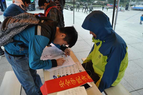 11月15日,为了倡导“绿色环保”理念,解决同学们的外出乘车问题,一场由力建学院青年志愿者协会主办,安全学院等10院联办的义务公交卡办理活动在二食堂广场顺利举行.