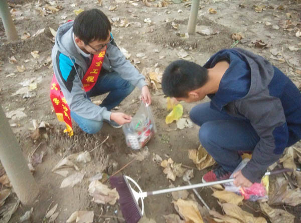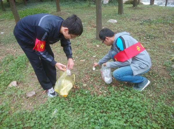 尽管天气较为寒冷,但服务分队E.F组成员依然在下午三点五十准时在二食堂广场集合。在了解校服务大队的交给的任务后,服务分队成员马不停蹄地奔向自己的阵地――不显山,这足以显示队员热情之高。到达不显山后,队员们认识到了自己任务的艰苦。不显山为一处小山丘,到处覆盖着杂草、树林、树枝,一些垃圾掺杂在其中。但分队队员不畏艰苦,迅速分配责任区,以加快工作效率和提高工作质量。一部分队员深入树林深处,用自己的双手扒开残枝败叶,将覆盖在下面的垃圾仔仔细细地挖出来。一部分队员在小路上弯腰捡起一片片垃圾,并向游玩的同学宣传保护环境的意识。就这样,时间一点一点得流逝,最后同学们个个满头大汗,都顾不上沾到衣服上的泥渍。但当服务分队成员回头看过自己打扫的地方焕然一新,都纷纷都露出了笑脸。校服务大队的考核部的督察员对服务分队成员的不畏艰辛的精神提出表扬,对任务完成的质量赞不绝口!