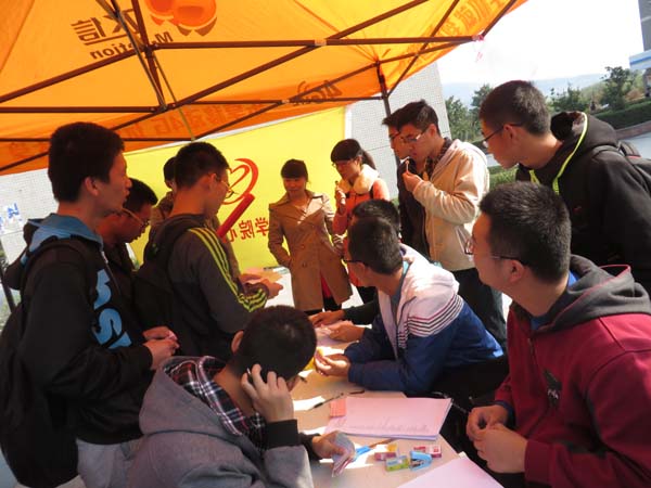 上午阳光和煦,11点活动正式开始。虽然活动刚刚进行,但大赛帐篷周围早已挤满了参与活动的同学,人声鼎沸,同学们兴趣高昂,抢着猜纸条上的谜底。本次猜谜语大赛比赛规则为每位同学若知道谜语的答案,可将写有该谜语的纸条撕下,携带纸条交至心理自助中心工作人员处。若提交的答案正确,则在统计本上记录该同学的成绩,同时,该谜语随即作废,其他同学不能再使用该谜语;反之则不予以记录,其他同学可以继续猜测该谜语的答案。有趣的谜语题目与作答形式逐渐吸引了越来越多的同学参与其中,在订有纸片的尼农绳外缘围了一圈又一圈的同学,有的还踮着脚,伸长脖子,对着题目锁紧眉头。同学们三三两两,对谜面进行热切讨论,在冬日里少有的阳光下,为活动更增添了一份热烈。大会趣味横生,与其出的谜语有密不可分的联系,比如“土豆捅了包子致命一刀,怎么样了?”、“彼此搂紧,吻了又吻”等有趣的句子,极大的激发了同学们的好奇心。同时此次比赛设置了奖品,每猜对五个就可以兑换一个奖品,同学们在拿奖品时兴奋的表情让旁观的同学也不得不为他们高兴。另外在活动中还出现了穿着西装的大四同学们的身影,他们在忙碌的同时也参与了其中,与大家共同娱乐,更增添了本次活动的魅力。