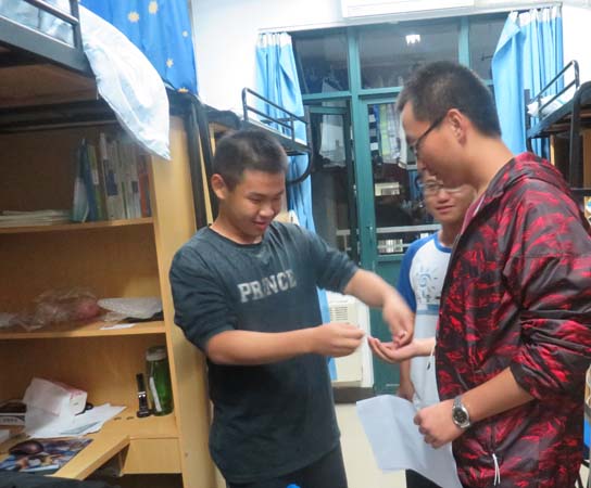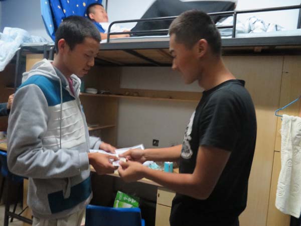晚上九点,参加募捐活动的所有人员在梅三一楼大厅集合完毕。随后,服务分队队长齐世铭介绍了此次募捐活动的具体内容和意义。他说,本次献爱心活动要本着自愿的原则,鼓励同学们为需要帮助的人贡献自己微薄的力量。接着,他做了分组安排。志愿者们一共被分成了三个小组。一组到大四同学的宿舍宣传,其它两组负责大一、大二、大三的宣传并发放”爱心奉献”倡议书。“爱心奉献活动不在于募捐物质的多少,一支笔、一本书、一枚硬币、一块橡皮擦等都可以传递我们的爱”成为各小组宣传的口号。每到一处宿舍,同学们都以极大的热情发起了一场场募捐活动的热潮。大家纷纷将自己的一份爱心投放到募捐箱里或交给负责募捐活动的同学。整个募捐活动如火如荼地进行了一个多小时。