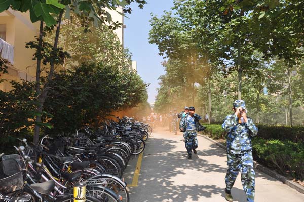 的全体14级新生们在辅导员孙婷、郑文奇和倪炎的带领下积极参加了火灾疏散演习。
