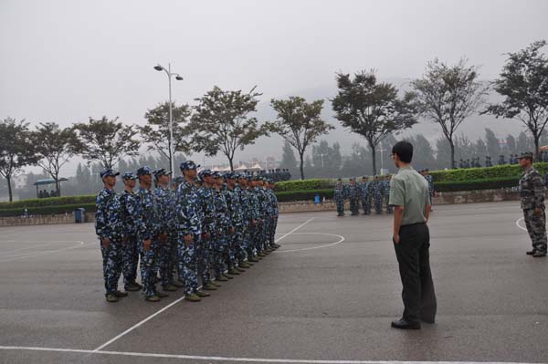 下午2点30,14级的新生们在辅导员老师郑文奇和承训官兵们的带领来到第一次会操表演的场地,尽管天下着小雨,但是14级新生们依然在各自排长的带领下开始了训练。从训练中可以看出来各排都展现出了优秀的队列会操水平,他们每个人都严格要求自己。“稍息”、“立正”、“停止间转法”、“齐步走”,这些已经熟悉到不能熟悉的动作同学们都要求自己做到精益求精。而且在训练间歇,同学们还相互指出彼此在训练中出现的错误,通过沟通学习,进行纠正,尽管在雨中,同学们依然认真刻苦地进行训练,每一个同学的动作都趋于完美。