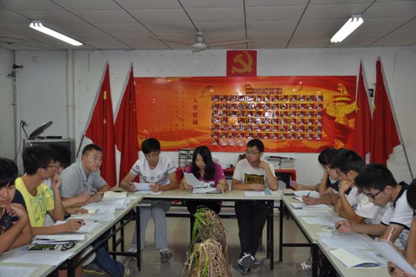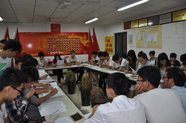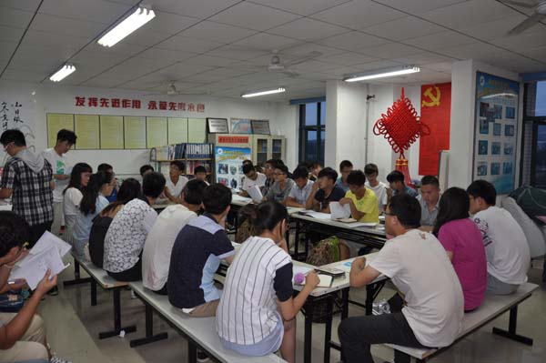 会议开始之前,组织部部长孙明哲给各部门部长发放了新生活动的负责表,军训内务帮扶表,本科生报到须知,军训内务要求等文件。18:30,会议正式开始,学生会主席陶冰冰首先细致地给每个部门部署任务,并耐心地为提出问题的部长解答。然后安全学院学生会副主席彭扬就新生军训内务帮扶方面,强调作为学长,作为学生会干部应当给新生做出好的榜样。各部门部长都表示将尽力做好接下来的新生工作。