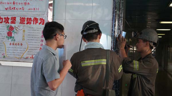 该问卷由矿山周边环境状况调查及矿山安全调查两大部分组成。“矿山安全行”全体成员深入矿工所在地及其周边地区分别展开积极调研,班前会调研及职工宿舍调研为调研队的主攻目标。面对调研队的请求,矿工人员给予了热情的配合,是以调研任务顺利展开。